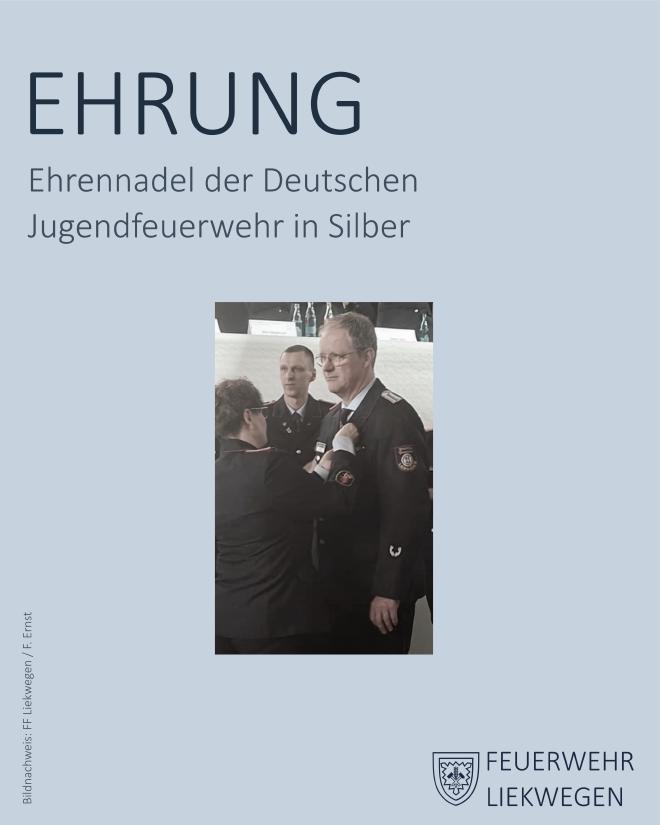 Die Ehrennadel der Deutschen Jugendfeuerwehr in Silber gehört zu den höchsten Auszeichnungen im Bereich der Jugendfeuerwehr und wird an Persönlichkeiten verliehen, die sich über viele Jahre hinweg in besonderer Weise um die Förderung und Entwicklung der Jugendfeuerwehr verdient gemacht haben.